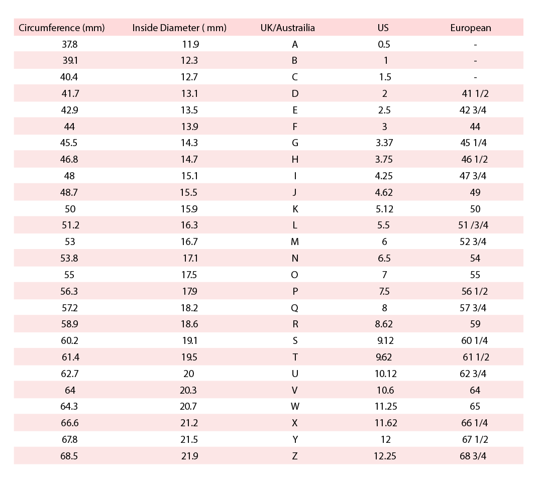 Use our chart to make sure you order the correct ring size for you. All rings on our website are listed in UK sizes. Use our chart to convert your size to an alphabetical UK size, then head to our rings to choose yours.